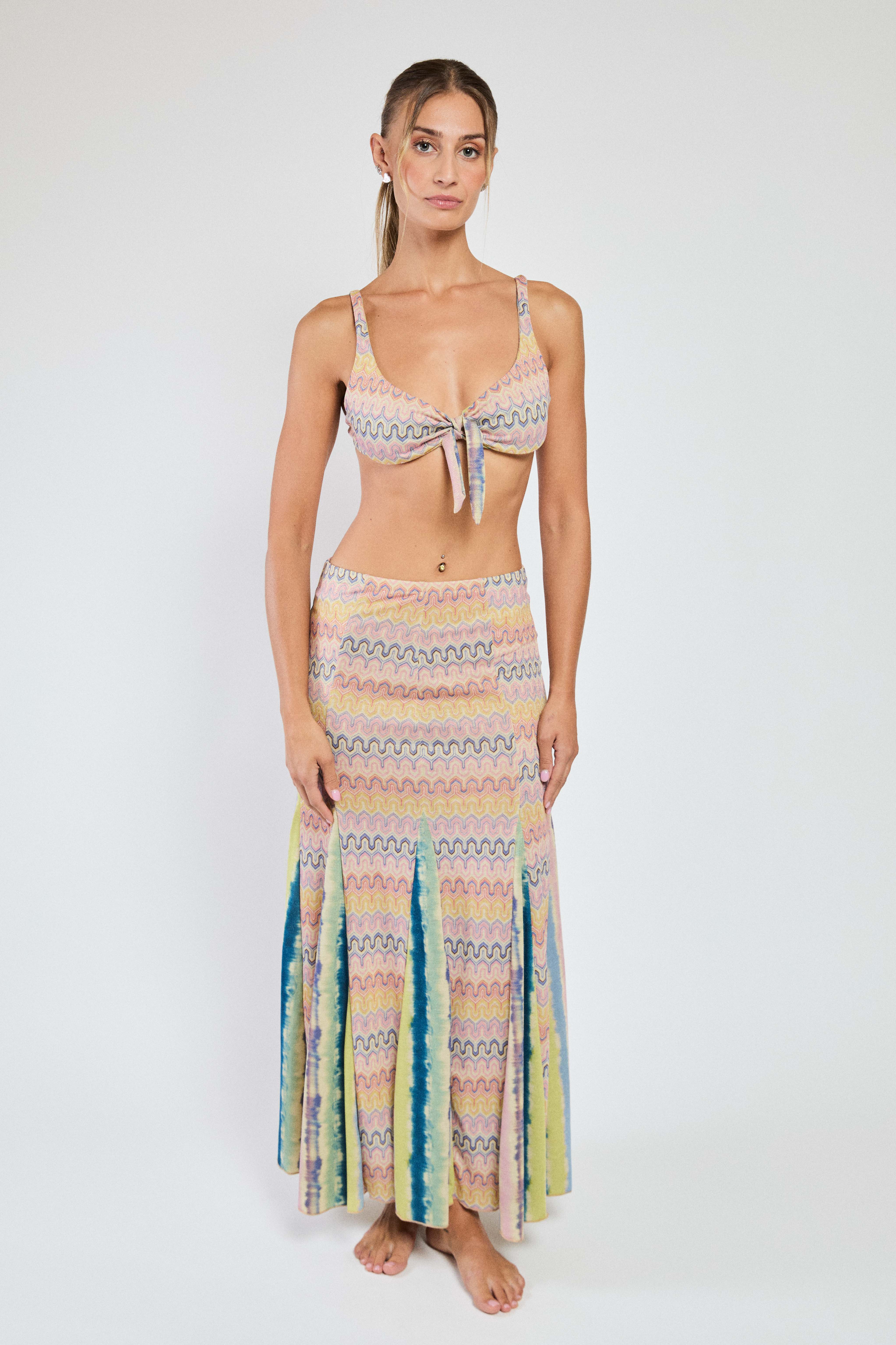 The model wears a size 42. To take the best care of our garments, we recommend that you hand wash them in cold water, wring them out gently and do not expose them to heat sources.